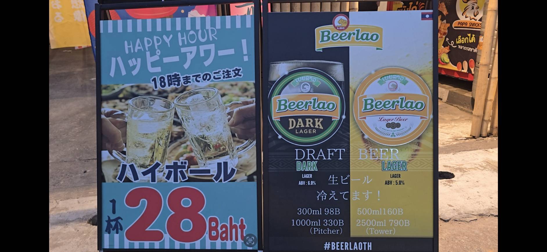 ハッピーアワーではハイボールが驚きの28バーツ、生のビアラオやビアラオダークも楽しめます。